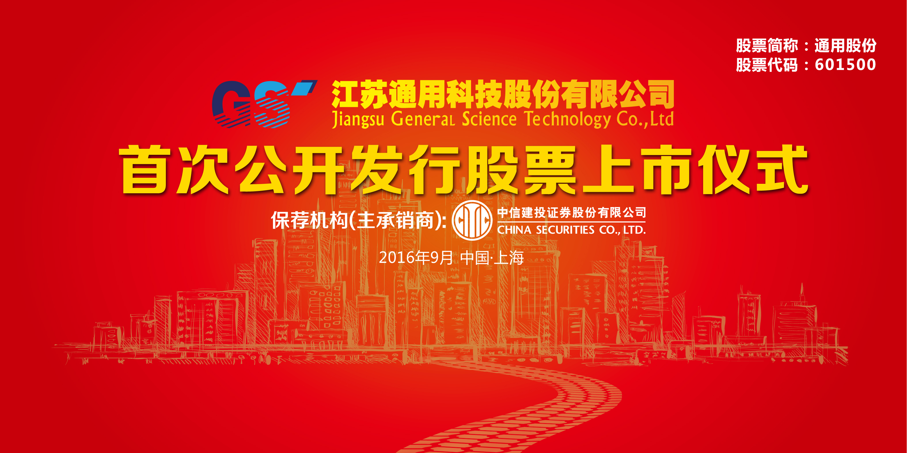 9月19日,江蘇通用科技股份有限公司首次公開發行A股上市儀式在上海證券交易所隆重舉行,隨著開市鳴鑼,標志著通用股份(股票代碼:601500)