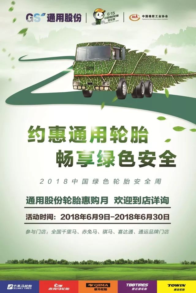 為了讓更多的普通消費者了解什么是綠色節(jié)能輪胎,輪胎標簽的作用,以及輪胎安全使用知識,同時也為了答謝消費者長期以來的支持,通用股份在全國通用品牌門店(千里馬、赤兔馬、通運、騏馬、喜達通)開展“約惠通用輪胎 暢享綠色安全”的輪胎惠購活動(2018年6月9日至6月30日),并采取滿減優(yōu)惠、幸運抽獎、好禮相送等形式,以實實在在的優(yōu)惠,與消費者共同擁抱安全出行。