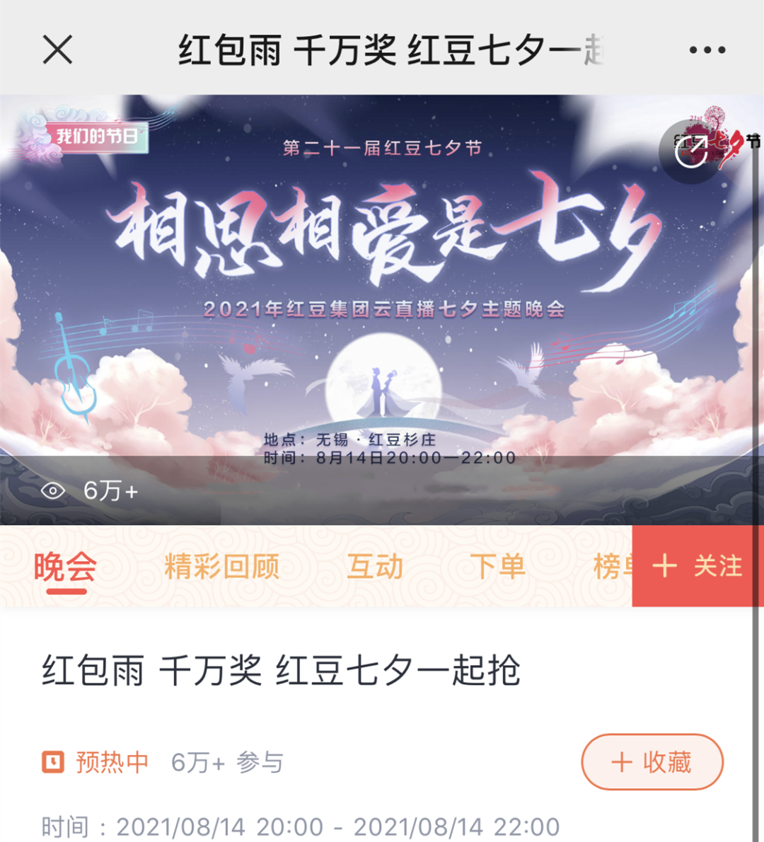 除了央視的七夕晚會,紅豆集團還會給大家奉獻一場特別的紅豆七夕節(jié)晚會。與大家在七夕節(jié)當晚共享視覺與福利盛宴。去年的紅豆七夕節(jié)20周年直播主題晚會更是創(chuàng)造了1.2億直播觀看量!