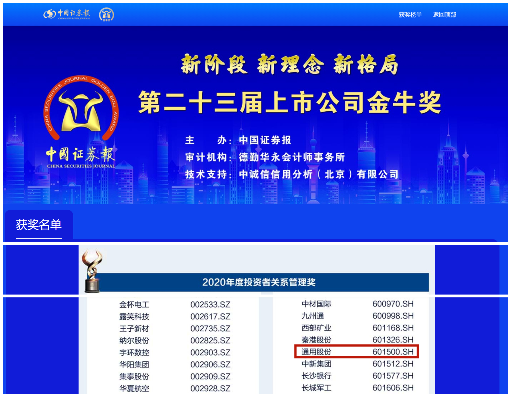 據了解,金牛獎是中國證券報鼎力打造的金融品牌,旨在公開、公正、公平原則下,表彰上一年度業(yè)績優(yōu)秀、治理卓越、具有崇高使命和社會責任感的上市公司。自1999年創(chuàng)立以來,金牛獎評選已至第二十三屆,是中國資本市場最具影響力的獎項,在中國資本市場中具有上市公司“奧斯卡”的美譽。