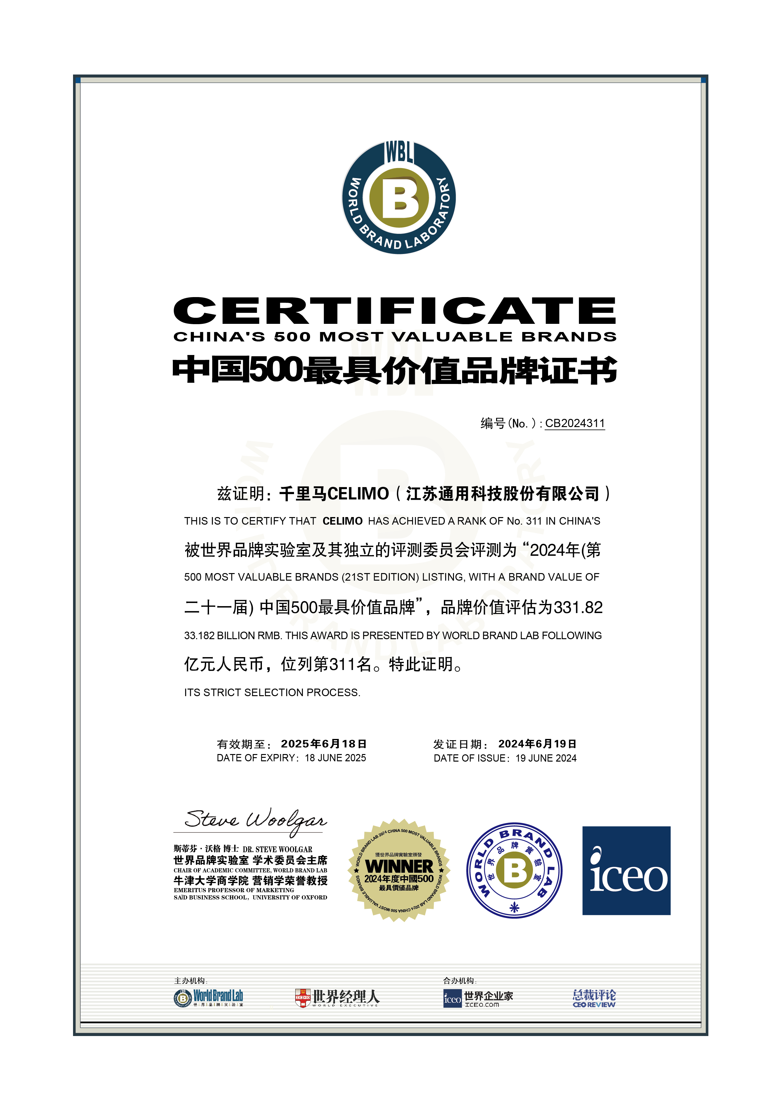 6月19日,世界品牌實驗室(World Brand Lab)主辦的第二十一屆“世界品牌大會”在京圓滿落幕。會上隆重揭曉了2024年“中國500最具價值品牌”榜單,通用股份旗下千里馬CELIMO品牌憑借331.82億元人民幣的品牌價值,排名躍升至榜單第311位,連續六年獲此殊榮,彰顯了其強大的品牌實力。